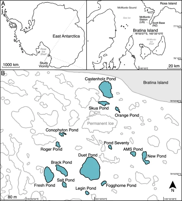 Fig. 1: Study area and sample location. A The geographical location of the study vicinity and Bratina Island. B Detailed depiction of the meltwater ponds off the coast of Bratina Island based on satellite imagery. Sites included in this study are outlined in black and coloured in blue. Not shown: Bratina Lagoon, located approximately 1 km west of the area depicted.